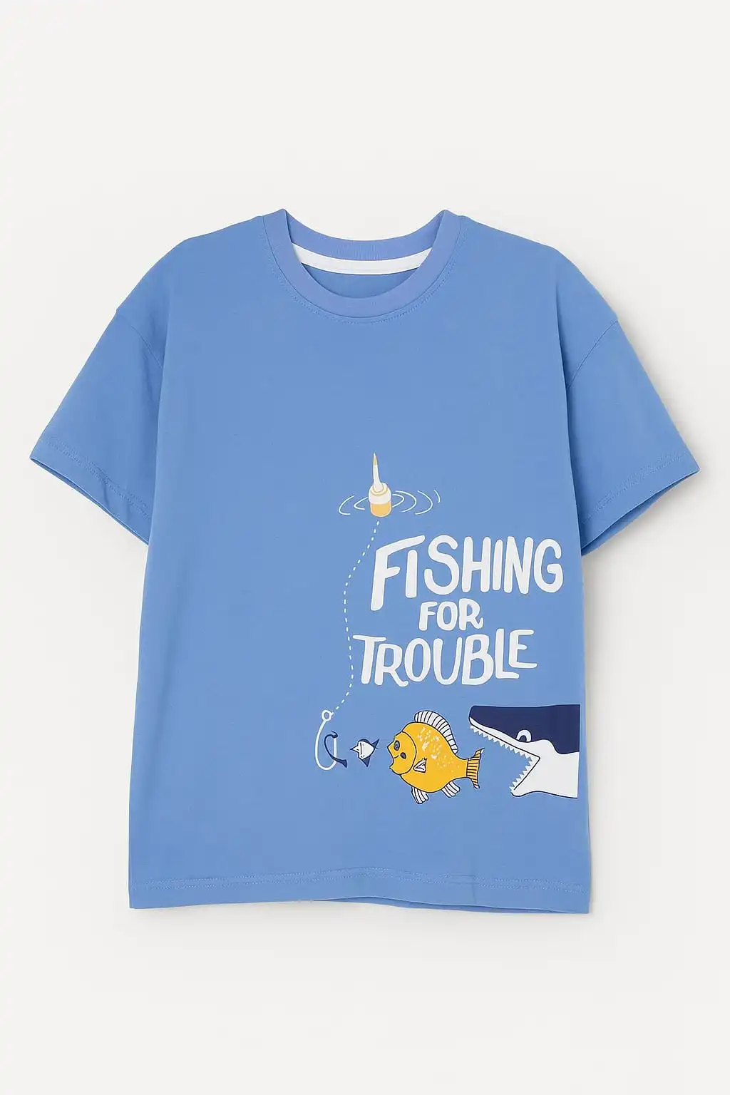 A fun, bright blue cotton T-shirt with a playful “Fishing For Trouble” graphic featuring a fish and a shark. Ideal for casual summer wear.